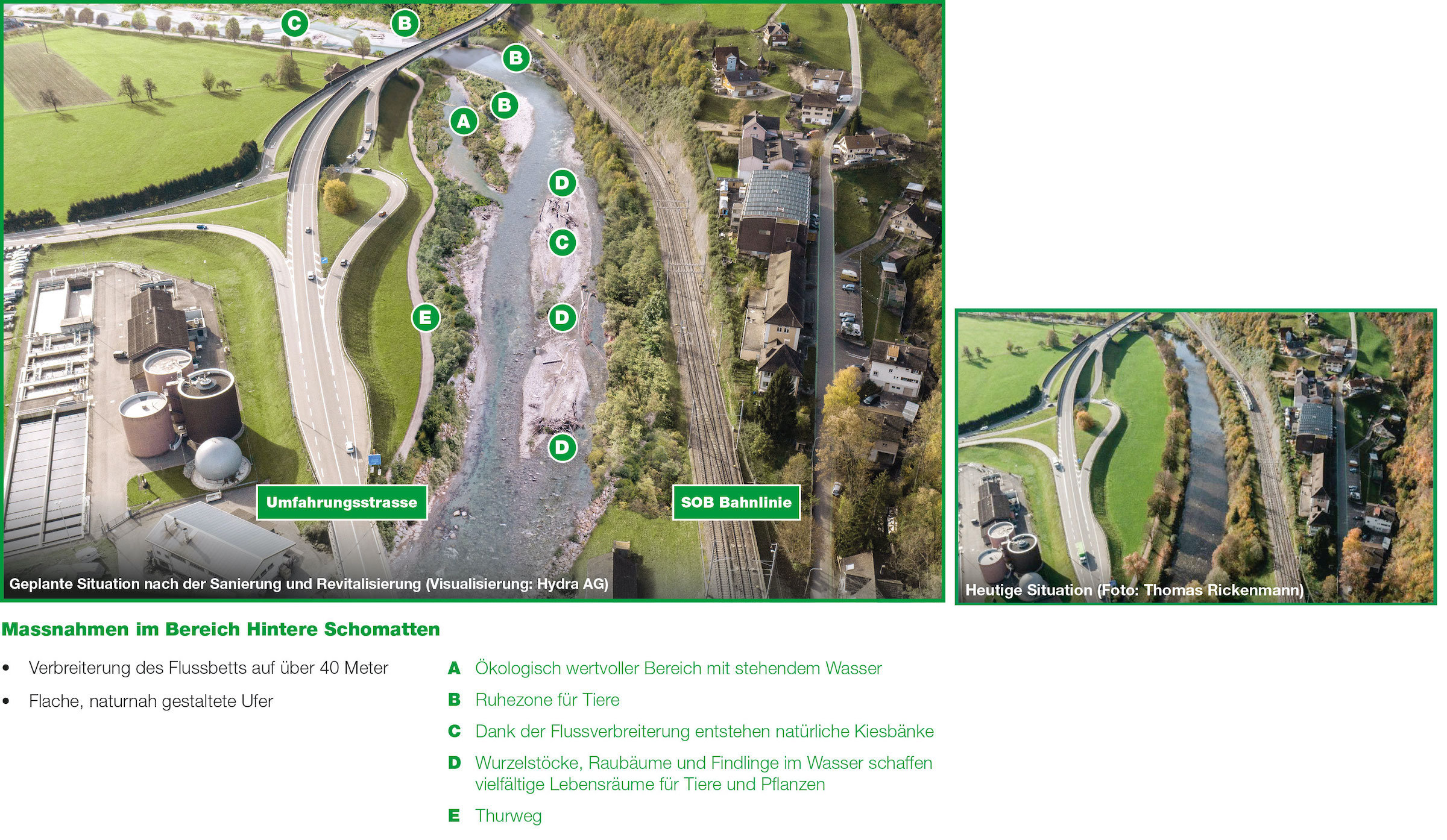 Auch hier wird der Flussraum mit verschiedenen Strukturen gestaltet wie Wurzelstöcken, Raubäumen und Findlingen im Wasser, um vielfältige Lebensräume für Tiere und Pflanzen zu schaffen. Dank der Verbreiterung der Thur bilden sich im Flussbett natürliche Kiesbänke, die das Gewässer ebenfalls ökologisch aufwerten. So werden auch in diesem Bereich die klimatischen Bedingungen für Menschen, Tiere und Pflanzen deutlich besser (siehe dazu: Prüfbericht "Auswirkungen auf Klima und Wassertemperatur"). Im Bereich "Hintere Schomatten" (bei der Brücke der Umfahrungsstrasse) werden ein Ruhezone für Tiere sowie ein ökologisch besonders wertvoller Bereich mit stehendem Wasser gebildet (siehe Visualisierung unten).