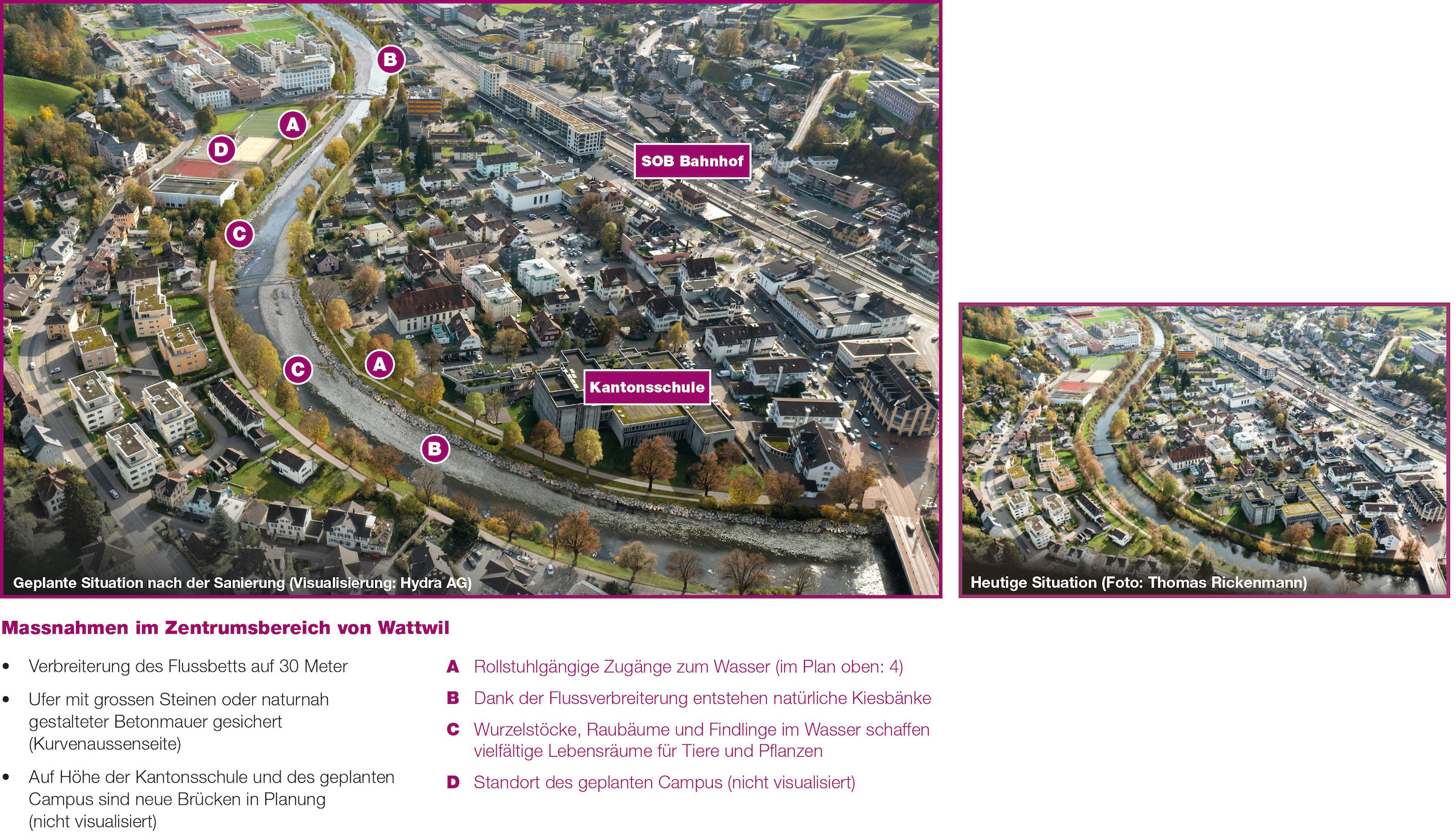 Früher erarbeitete Variantenstudien haben zudem gezeigt, dass bei der Thur in Wattwil die Abflusskapazität nur über eine Verbreiterung des Flussraumes erhöht werden kann. Eine Absenkung der Flusssohle, der Bau von Dämmen oder die Dämpfung der Hochwasser in Rückhalteräumen führen nicht zum Ziel.