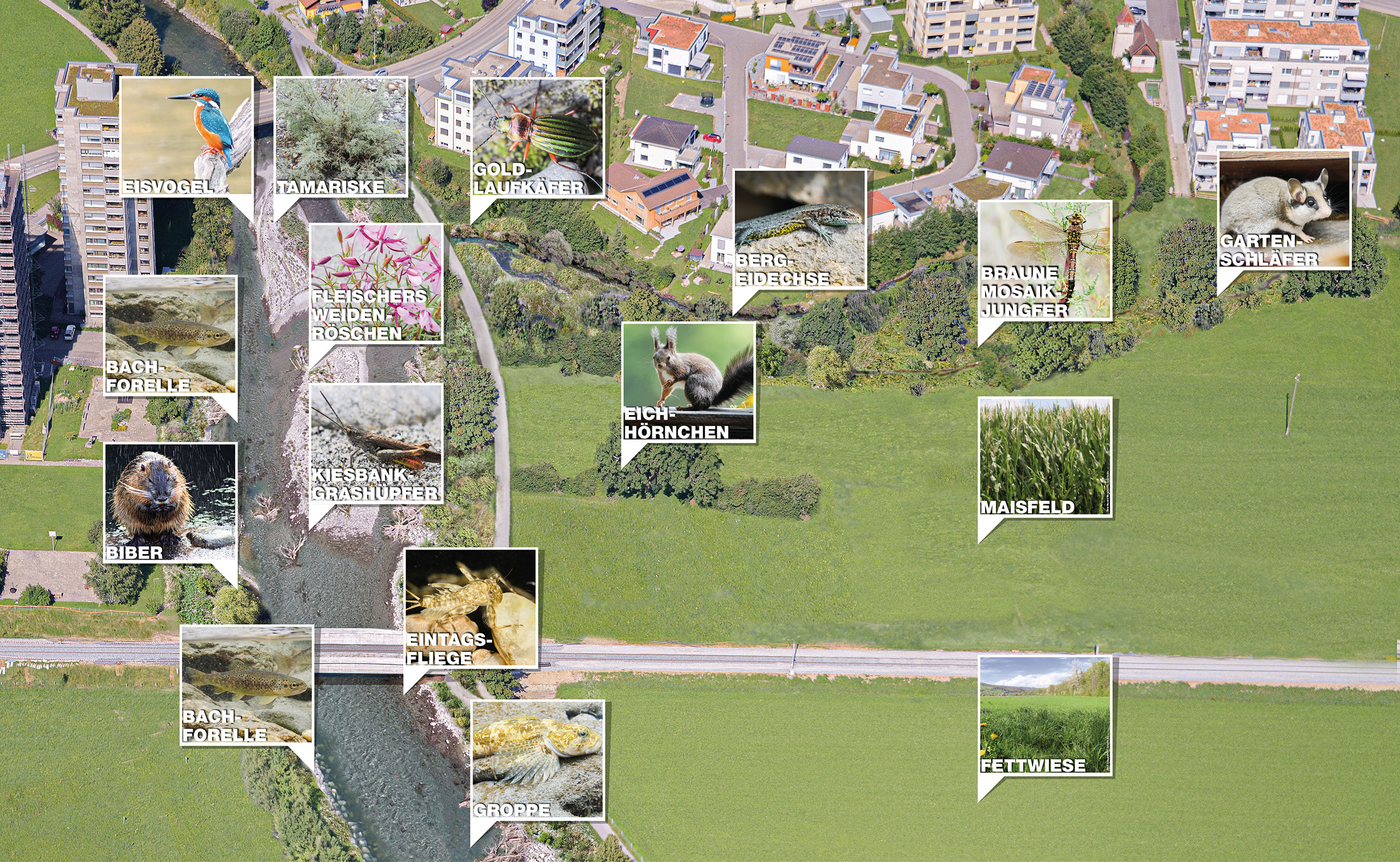 Visualisierung des Bereichs zwischen der Brücke Waisenhausstrasse und der SOB-Brücke: Diese Tiere sollen an der Thur wieder bessere Lebensbedingungen vorfinden (zum Vergrössern auf das Bild klicken)