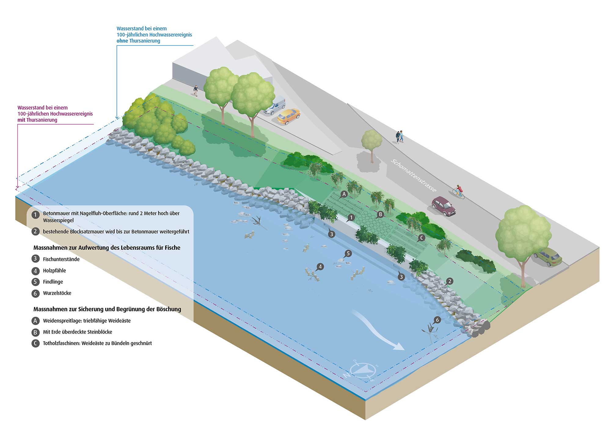 Die 20 Meter lange und knapp zwei Meter hohe Betonmauer erhält eine Nagelfluh-Oberfläche, um das Bauwerk gestalterisch dem natürlichen Flussraum anzupassen (siehe Grafik: 1). Solche Mauerabschnitte sollen an den Kurvenaussenseiten der Thur ober- und unterhalb der Postbrücke umgesetzt werden, um den Landbedarf zu reduzieren und das Ufer gegen Erosion zu schützen.