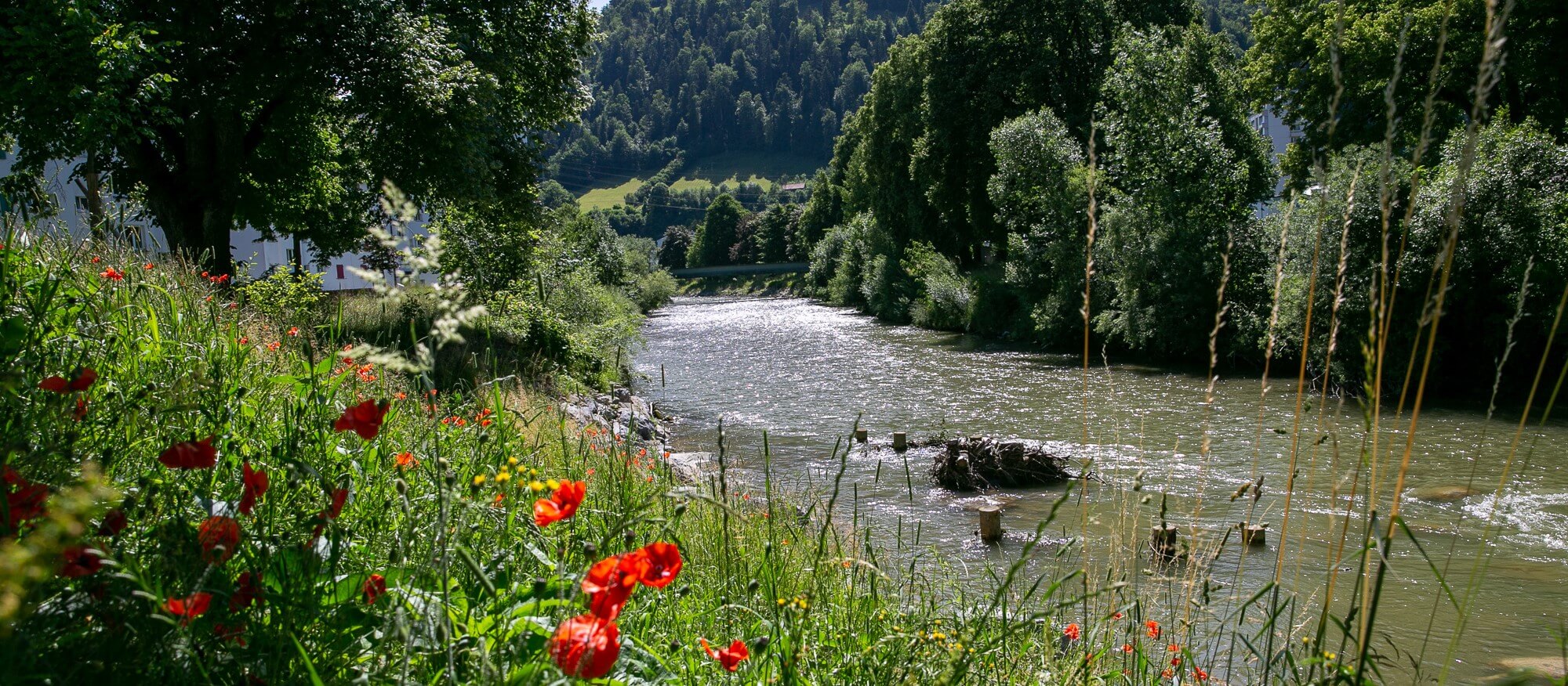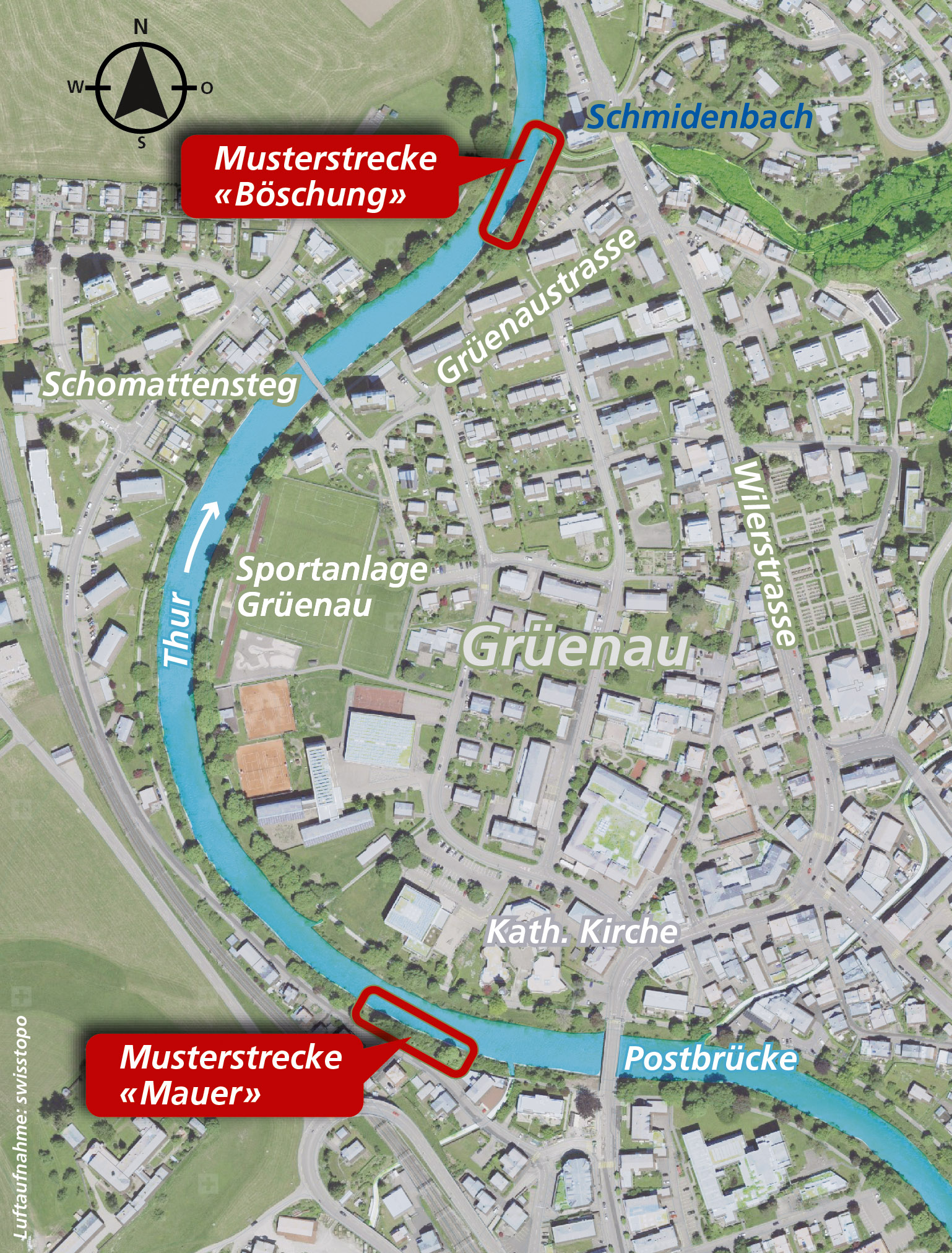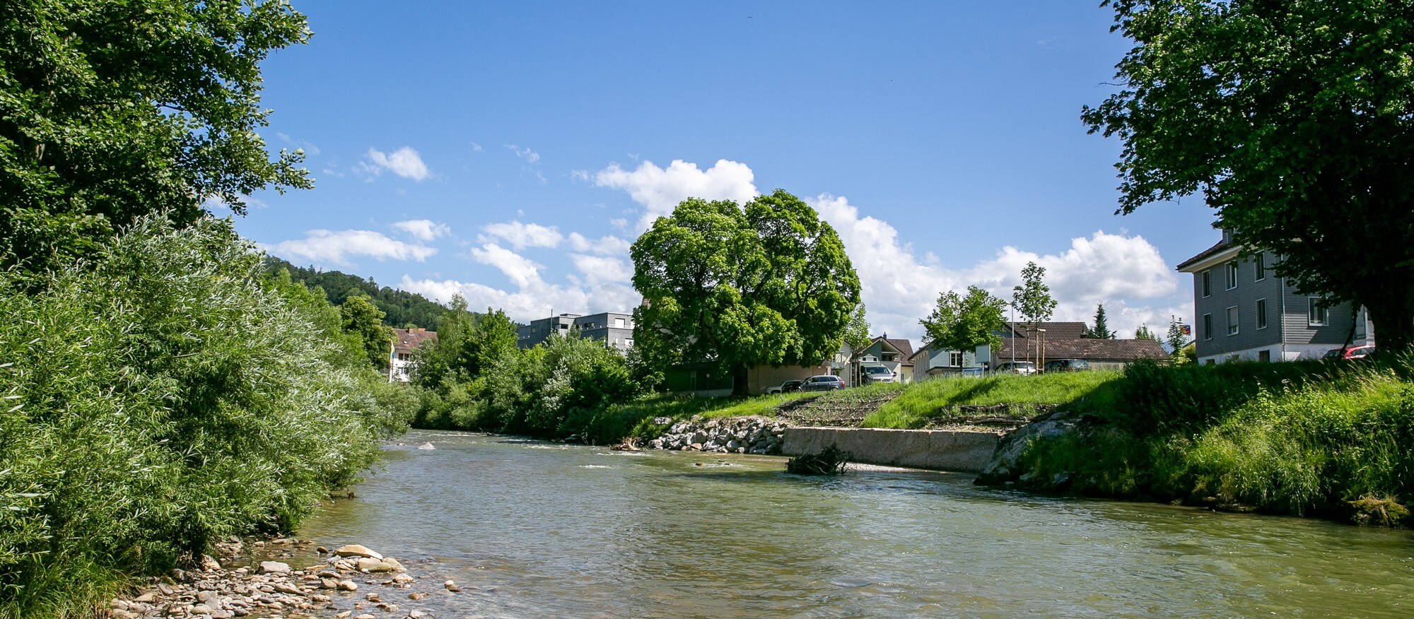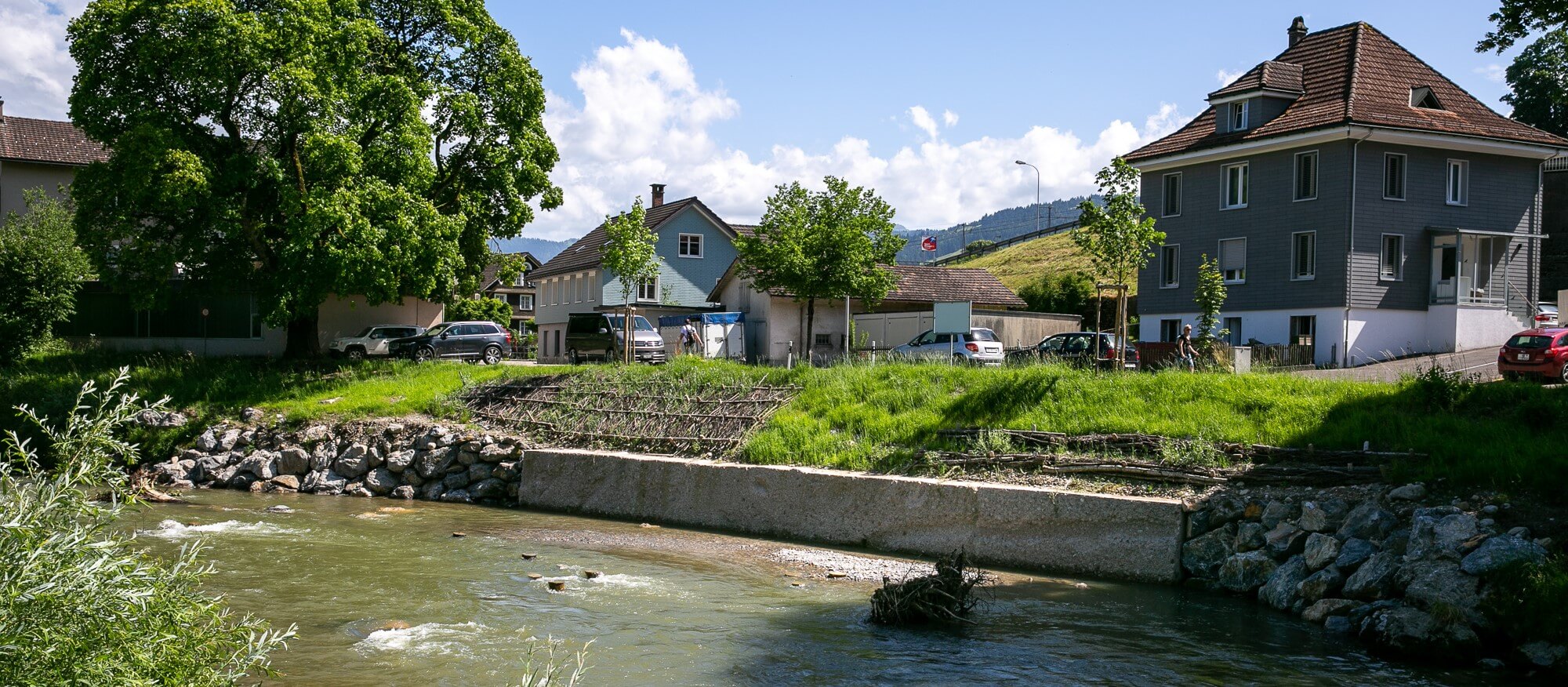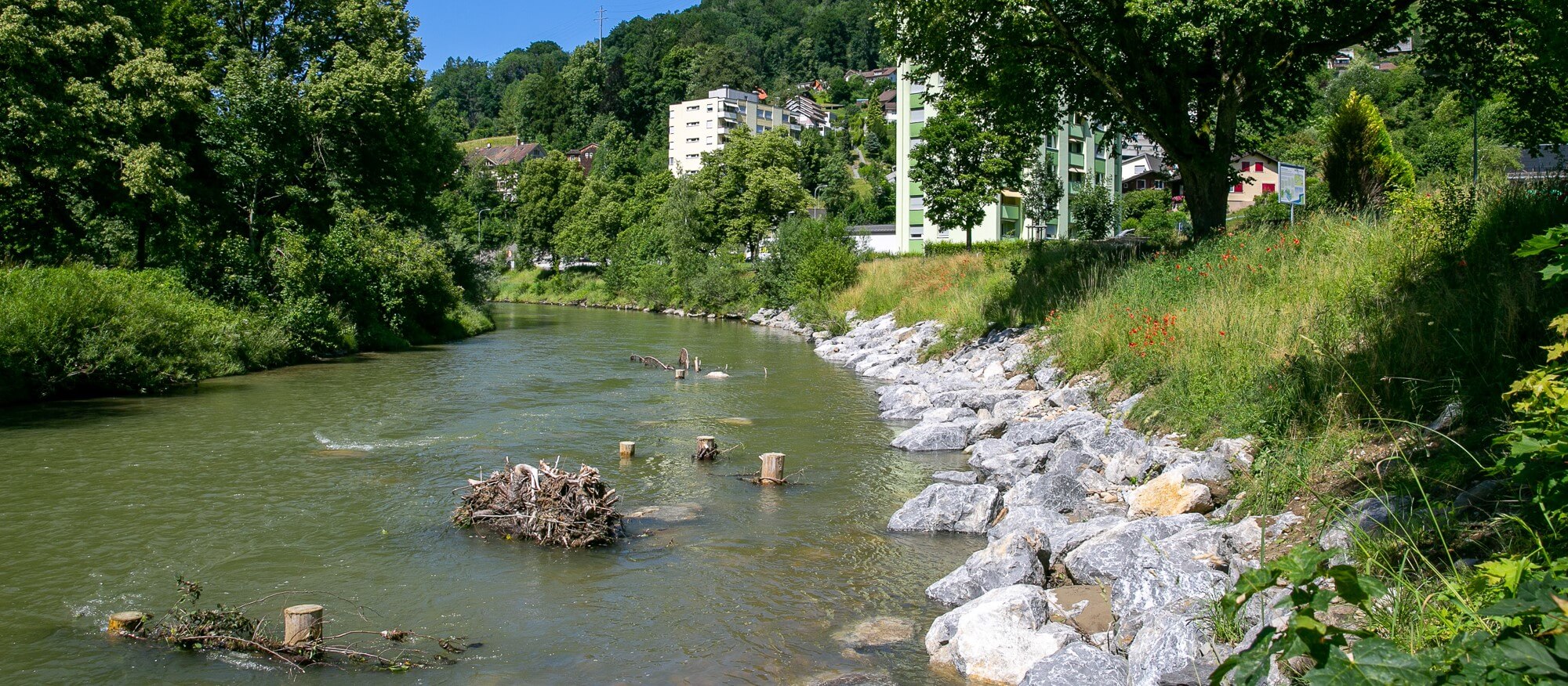 Die erste Musterstrecke «Böschung» wurde flussabwärts blickend am rechten Ufer oberhalb der Schmidenbach-Mündung realisiert. Sie zeigt, wie das Thurufer im Zentrum von Wattwil generell gestaltet werden soll.