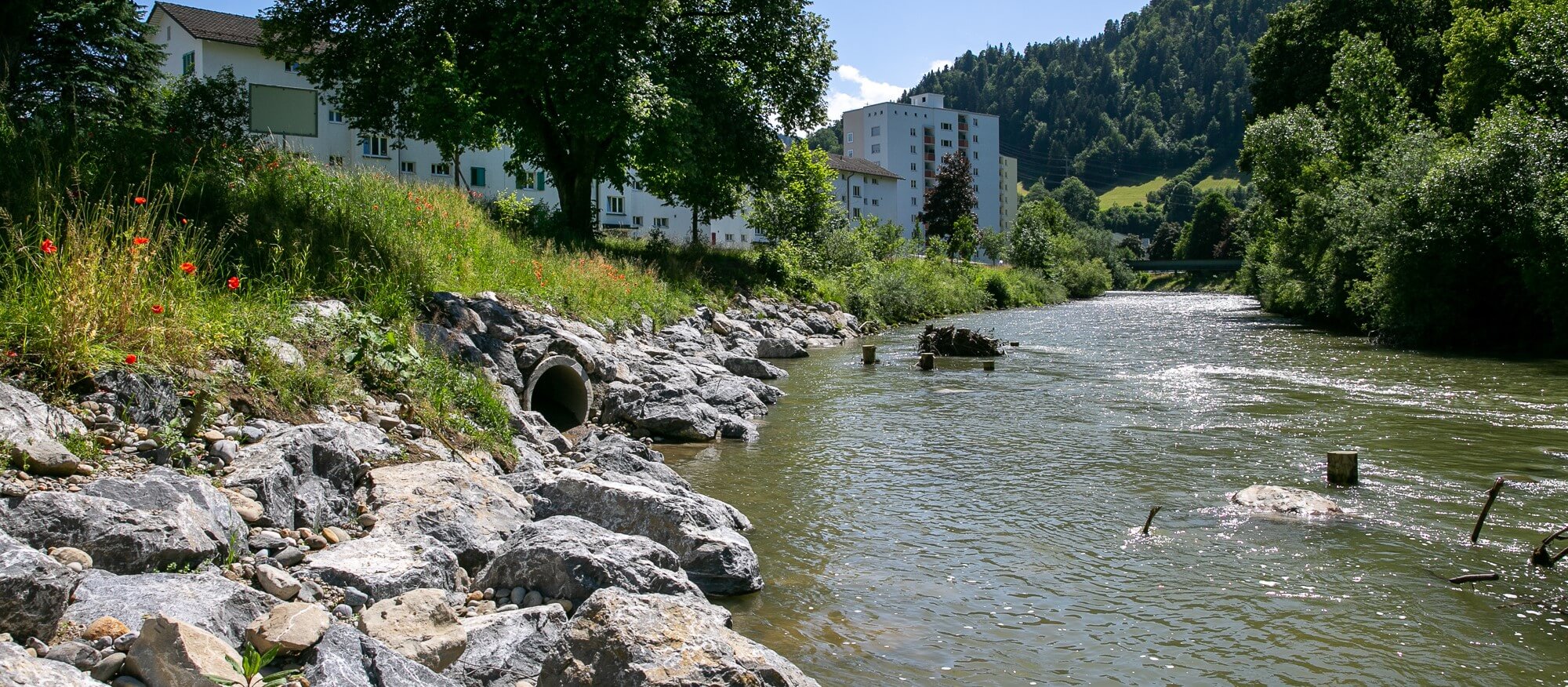 Wenn dereinst auch das gegenüberliegende Ufer erneuert ist, wird die Flusssohle hier rund 30 Meter breit sein (heute: 22 Meter). Damit können in diesem Flussabschnitt 410 m3 Wasser pro Sekunde abfliessen. Dies entspricht einem Hochwasser, das statistisch betrachtet durchschnittlich alle 100 Jahre einmal auftritt (sogenanntes hundertjährliches Hochwasserereignis).