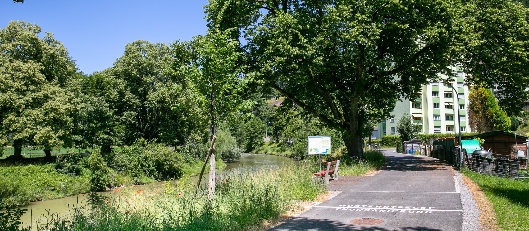 Der geplante rechtsufrige Rad- und Gehweg soll gegenüber heute von durchschnittlich 2.3 bis 3.4 Meter auf 3.5 Meter verbreitert werden, damit für Velofahrende und Fussgänger genügend Raum zur Verfügung steht. Der Weg wird auch für den Unterhalt der Thur und für Massnahmen bei Hochwasser-Ereignissen genutzt.